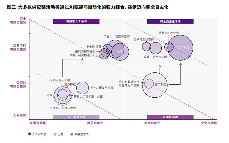 调研明确显示,AI将在不同程度上赋能几乎全部供应链活动(见图三)。目前,大多数能力仍处于较低的自动化和决策自主化水平,但在诸如“生产制造”“质量与生产控制”以及“客户与现场支持”等集群中存在特例。在这些领域,自动化已展现出强劲势头。例如,汽车制造商依赖机器人装配线,利用AI驱动的精准控制来提高生产速度并减少错误。