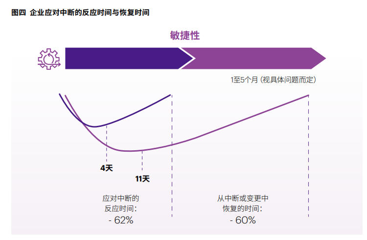 再者,自主化运营能够增强企业韧性,以更好地应对网络攻击、人才短缺、地缘政治动荡、极端天气事件以及原材料稀缺等风险。我们发现,企业预计应对中断的反应时间和恢复时间将分别缩短62%和60%(见图四)。这种强大的韧性在供应链中断愈发频繁和严重的当下尤为重要。