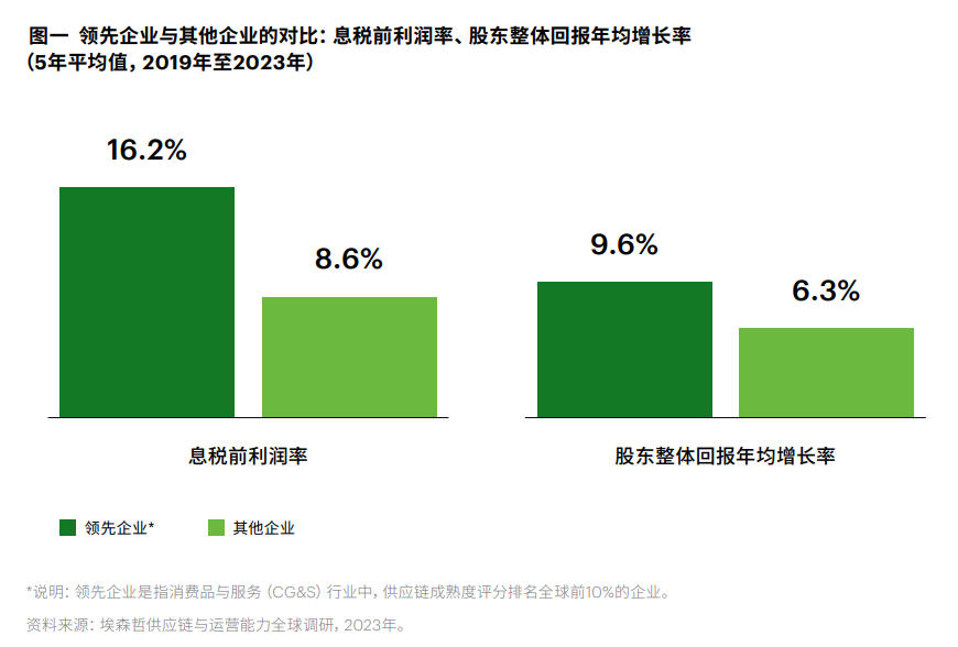 事实上,同时推动供应链优化与产品创新,并非一道顾此失彼的结构性难题,它们已成为企业加入角逐的先决条件。踟蹰不前的企业面临着落后风险,而供应链重构的先行企业已斩获回报。埃森哲调研表明,以2019年至2023年的五年平均息税前利润率评判,供应链成熟度排名前10%的消费品与服务企业较其他同行利润率高出7.6%(见图一)。研究表明,如果美妆行业能够加速产品上市,则有望释放额外860亿美元的营收。8