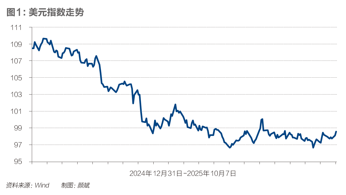 2025年,美元指数结束了自2022年3月美联储加息以来的强势上涨格局,开始由强转弱。2024年12月31日至2025年10月7日,美元指数从108.4816下降至98.5859,降幅高达9.1%(见图1)。同期,美元指数六大构成货币均对美元升值。其中,瑞典克朗、欧元、瑞士法郎、英镑、日元、加拿大元分别对美元升值15.1%、12.6%、12%、7.3%、3.4%和3%。美元指数下行给全球外汇市场带来扰动。