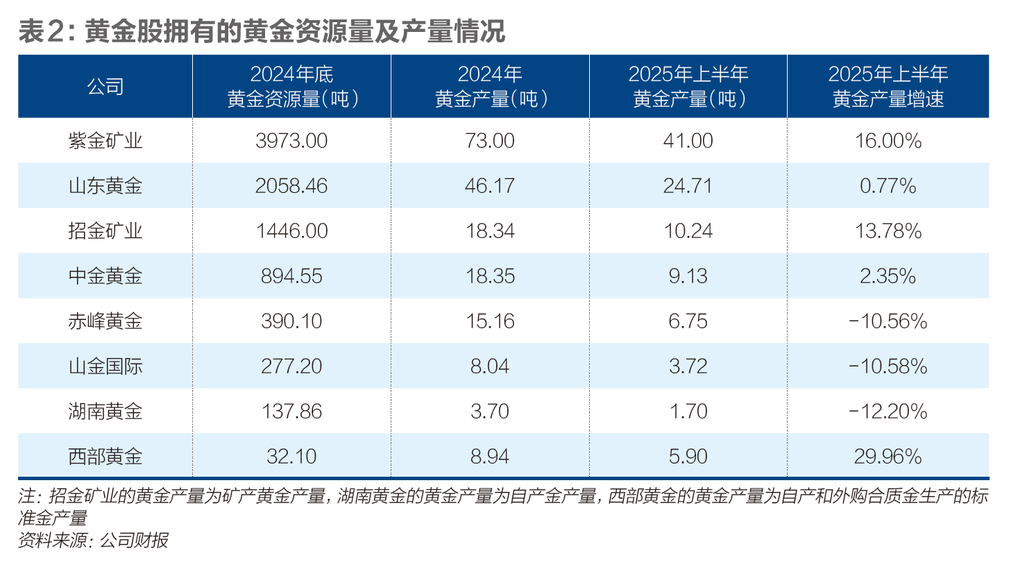 根据2024年报,紫金矿业、山东黄金、中金黄金矿产金产量位居国内前三,分别为73吨、46.17吨以及18.35吨。进入2025年,根据中报,紫金矿业和山东黄金矿产金产量依然稳居行业前两位,招金矿业则取代中金黄金跻身行业第三位。