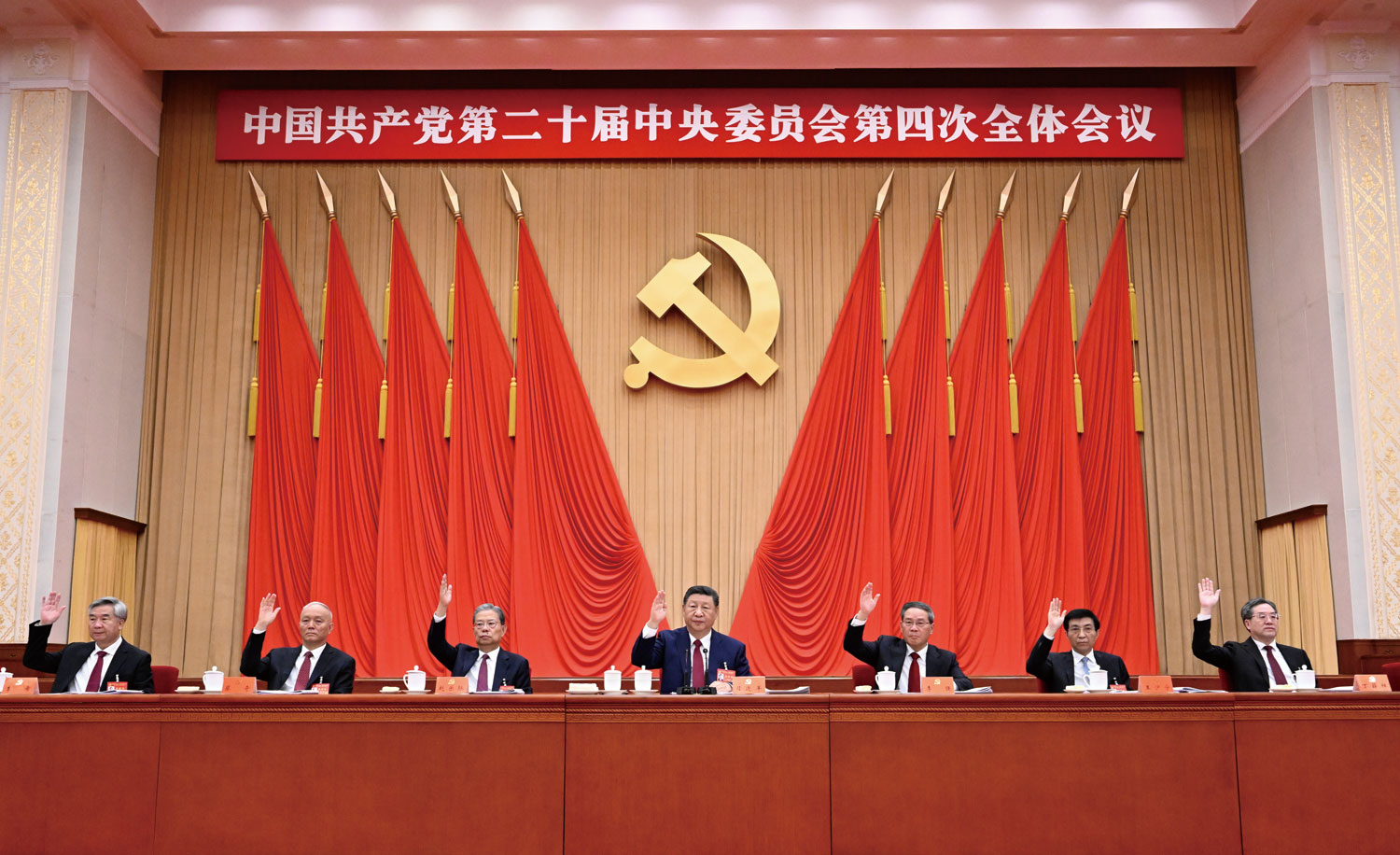 中国共产党第二十届中央委员会第四次全体会议,于2025年10月20日至23日在北京举行。习近平、李强、赵乐际、王沪宁、蔡奇、丁薛祥、李希等在主席台上。图/新华