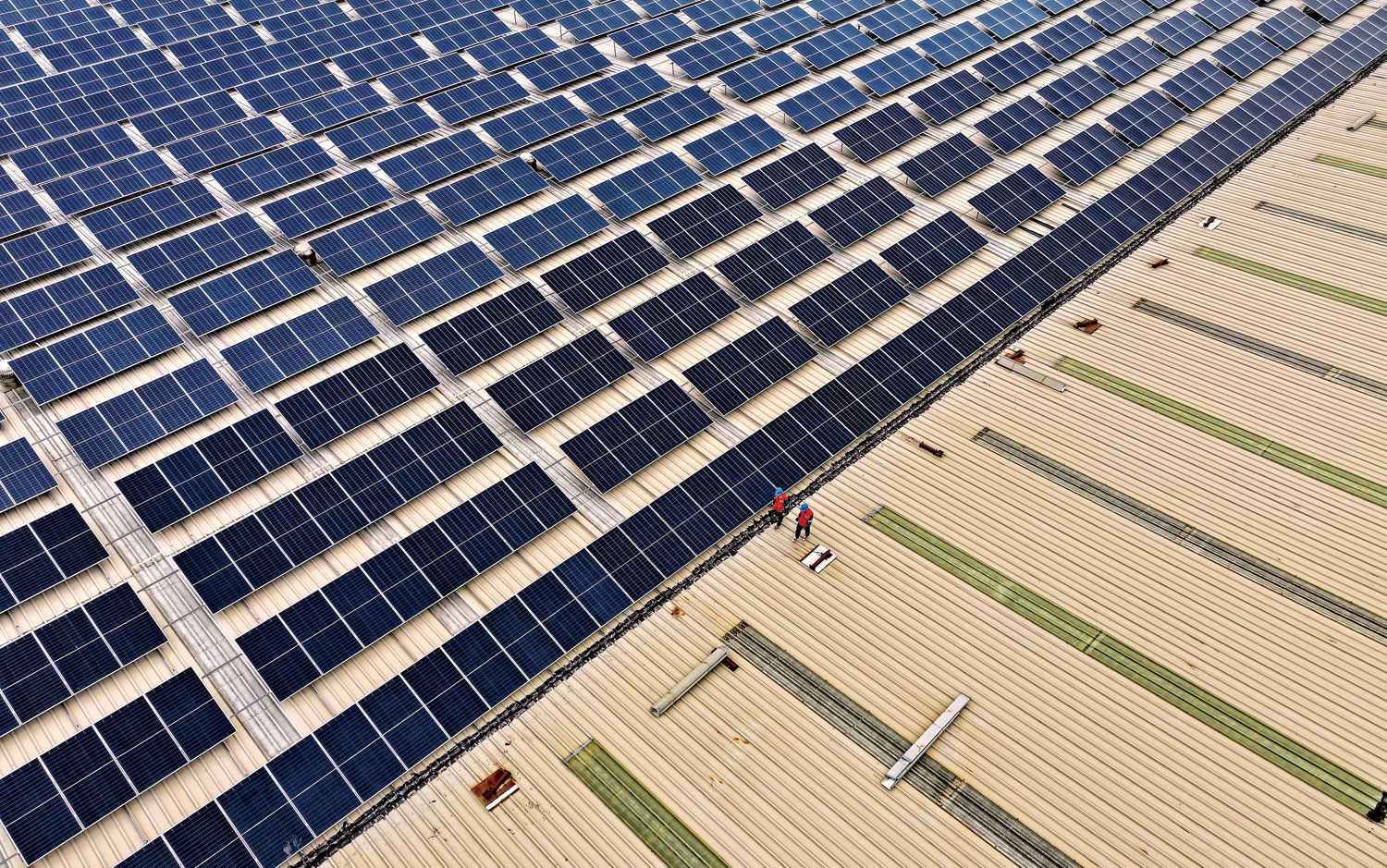 2025年9月24日,国网泊头市供电公司工人在当地一家铸造企业屋顶巡检光伏发电设备。图/新华