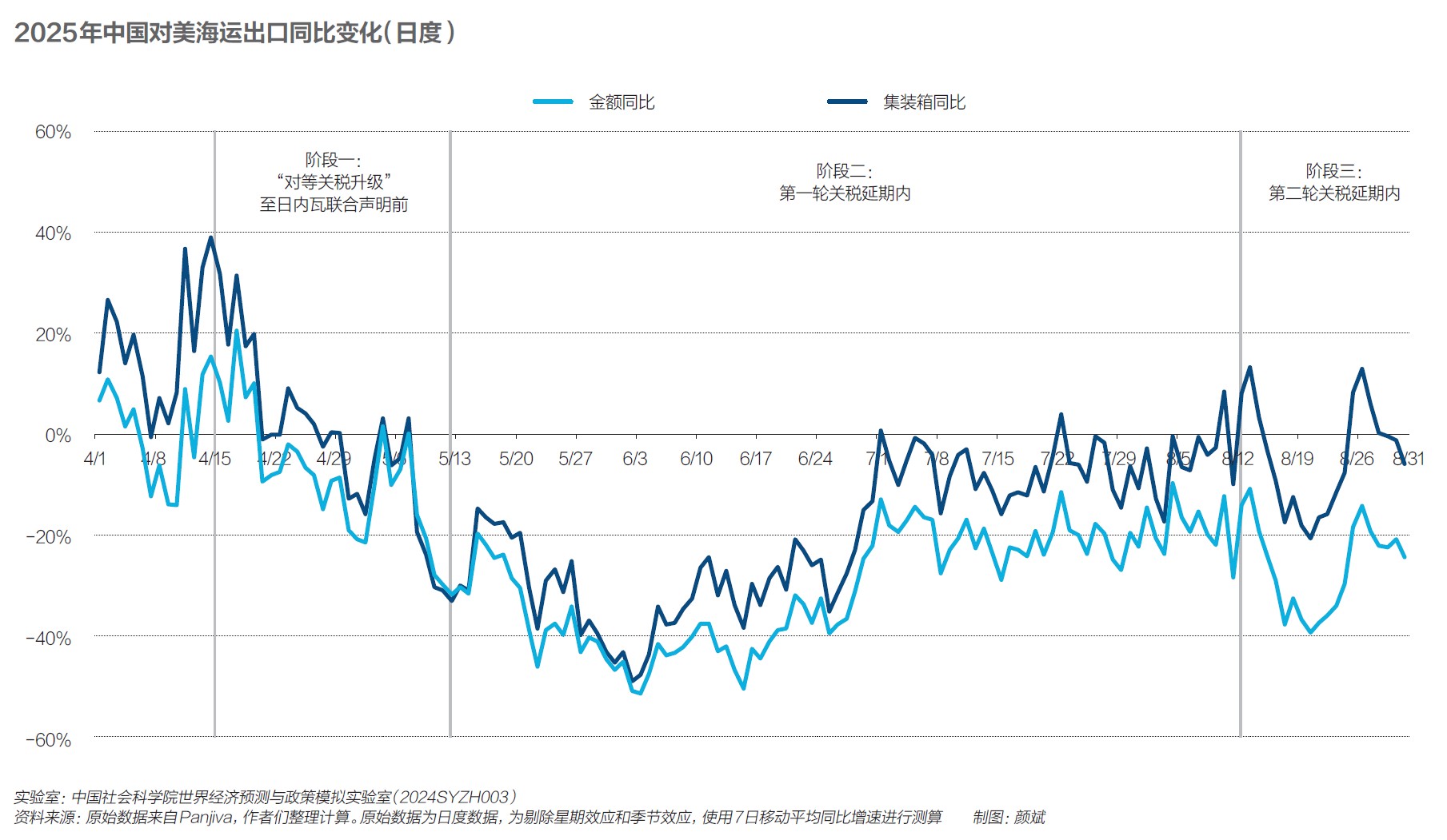 关税高压之下,企业面临的不确定性陡然上升。在5月13日,日内瓦协议后,美国从中国的进口仍然持续大幅度下降,从日度数据来看,这一负增长态势一直持续到7月初。前期的高关税政策与不确定性,通过订单递延和取消、在途航程以及履约安排滞后等渠道传导。7月之后,虽然微观层面的到港数据有所好转,但总体上仍然呈现负增长态势,且在第二轮关税延期前后出现了较大波动。