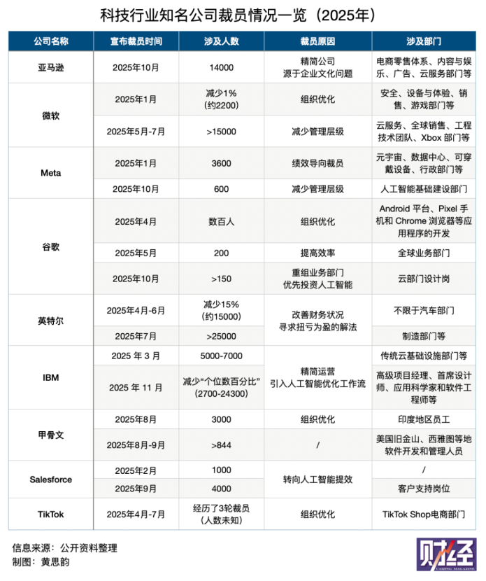 《财经》梳理近一年美国科技公司的裁员信息发现,在头部海外科技企业已公布的裁员信息中,今年累计涉及的员工总数已超过9万人,中国、北美、欧洲、印度等全球主要市场均有涉及。裁员理由包括人工智能的整合、消费需求的放缓、业务重组与资本投资,以及更广泛的成本削减措施。