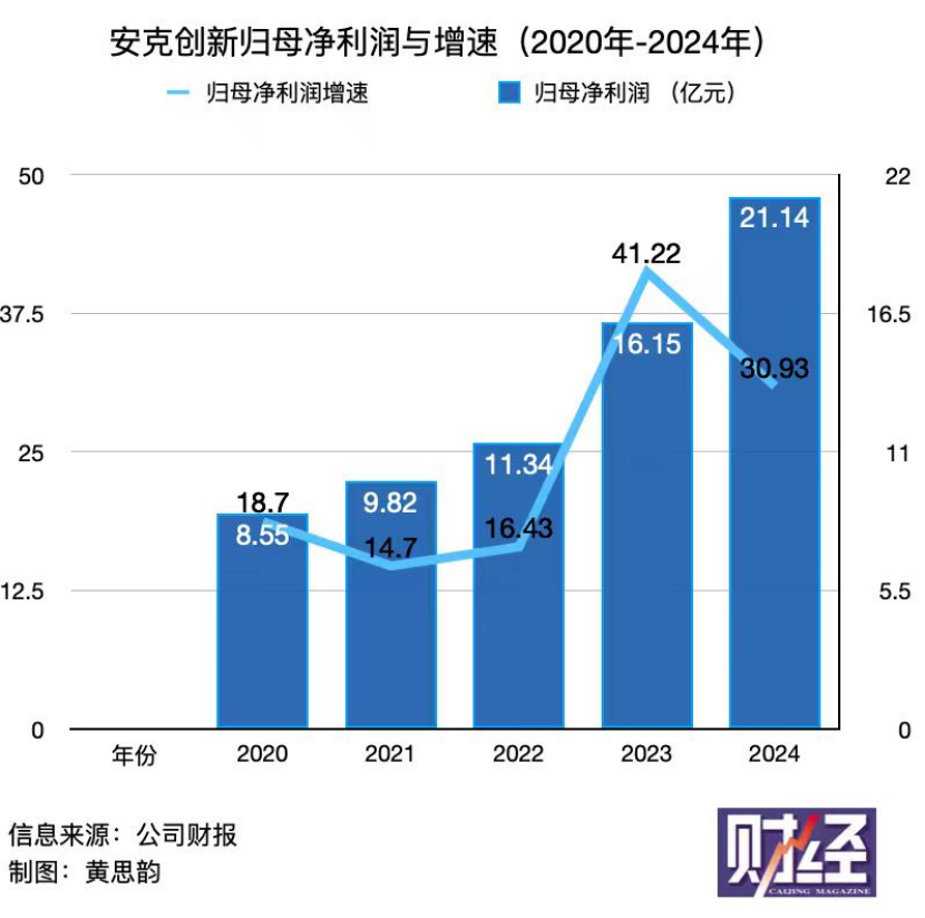 从2020年到2024年,安克创新总营收规模增长了近2.6倍,收入从93.5亿元增长至247.1亿元,归母净利润也从8.5亿元逐步增长至21.1亿元。其营收年复合增速经历了大起大落的过程——从2020年的40.5%,逐步下滑,在2022年触底至13.3%,随后逆势反弹,2024年增速41.4%,创下上市以来的最高纪录。归母净利润的增速也分别在2023年和2024年录得41.2%和30.9%的高增长。