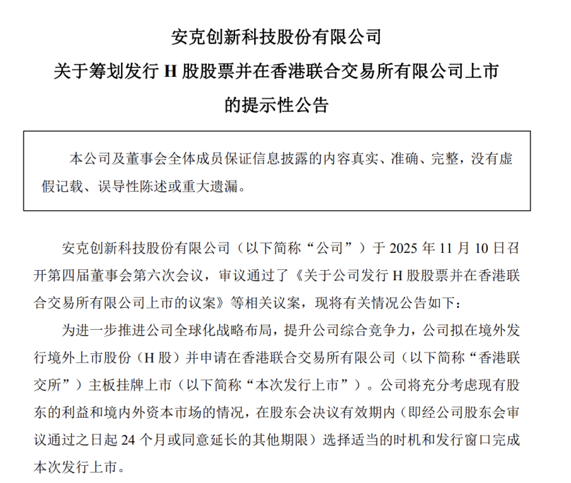 (图/《安克创新科技股份有限公司关于筹划发行H股股票并在香港联合交易所有限公司上市的提示性公告》页面)
