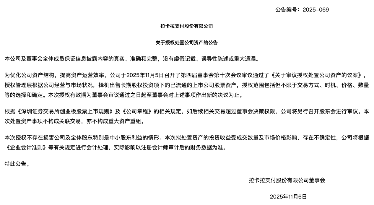 11月6日,拉卡拉支付股份有限公司发布《关于授权处置公司资产的公告》称,公司于2025年11月5日召开第四届董事会第十次会议审议通过了《关于审议授权处置公司资产的议案》。此次授权管理层可依据公司经营状况与市场行情,灵活择机出售长期股权投资项下已流通的上市公司股票资产,授权涵盖交易方式、时机、价格、数量等多方面的选择与确定。