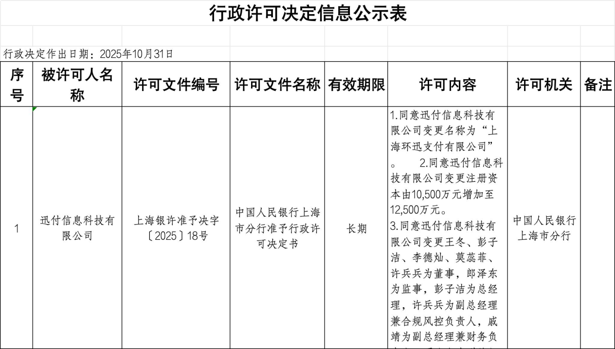 11月11日,央行上海市分行披露的许可信息显示,同意迅付信息科技有限公司变更名称为“上海环迅支付有限公司”;同意其变更注册资本由1.05亿元增加至1.25亿元;同意该公司变更彭子洁为总经理,许兵兵为副总经理兼合规风控负责人,戚靖为副总经理兼财务负责人,覃业金为副总经理兼技术负责人,莫蕊菲为副总经理等。