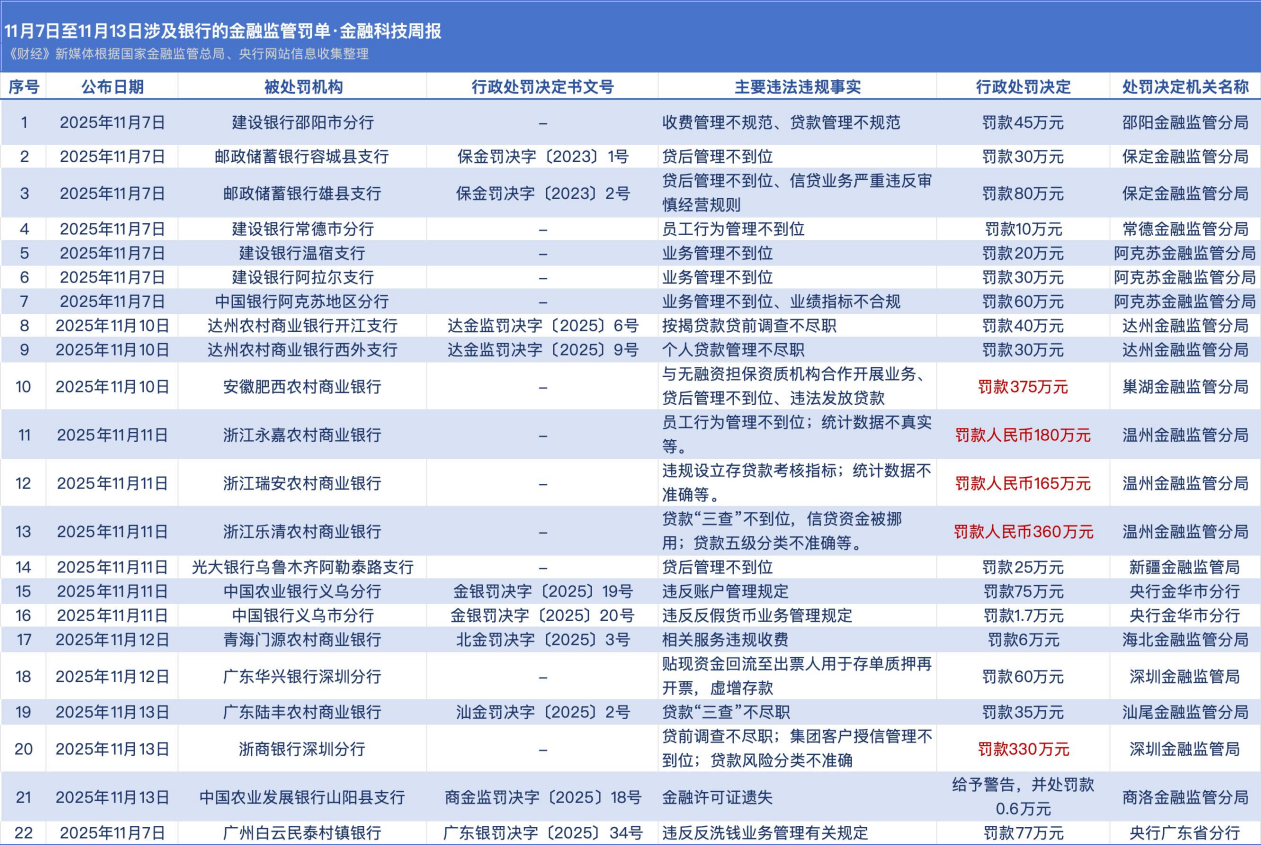 11月7日至11月13日,央行、国家金融监督管理总局官网披露了22张涉及银行的罚单。