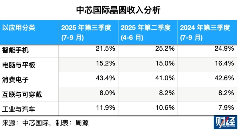 从应用领域来看,晶圆收入中智能手机、电脑与平板、消费电子、互联与物联网、工业与汽车领域占比分别为21.5%、15.2%、43.4%、8.0%和11.9%。