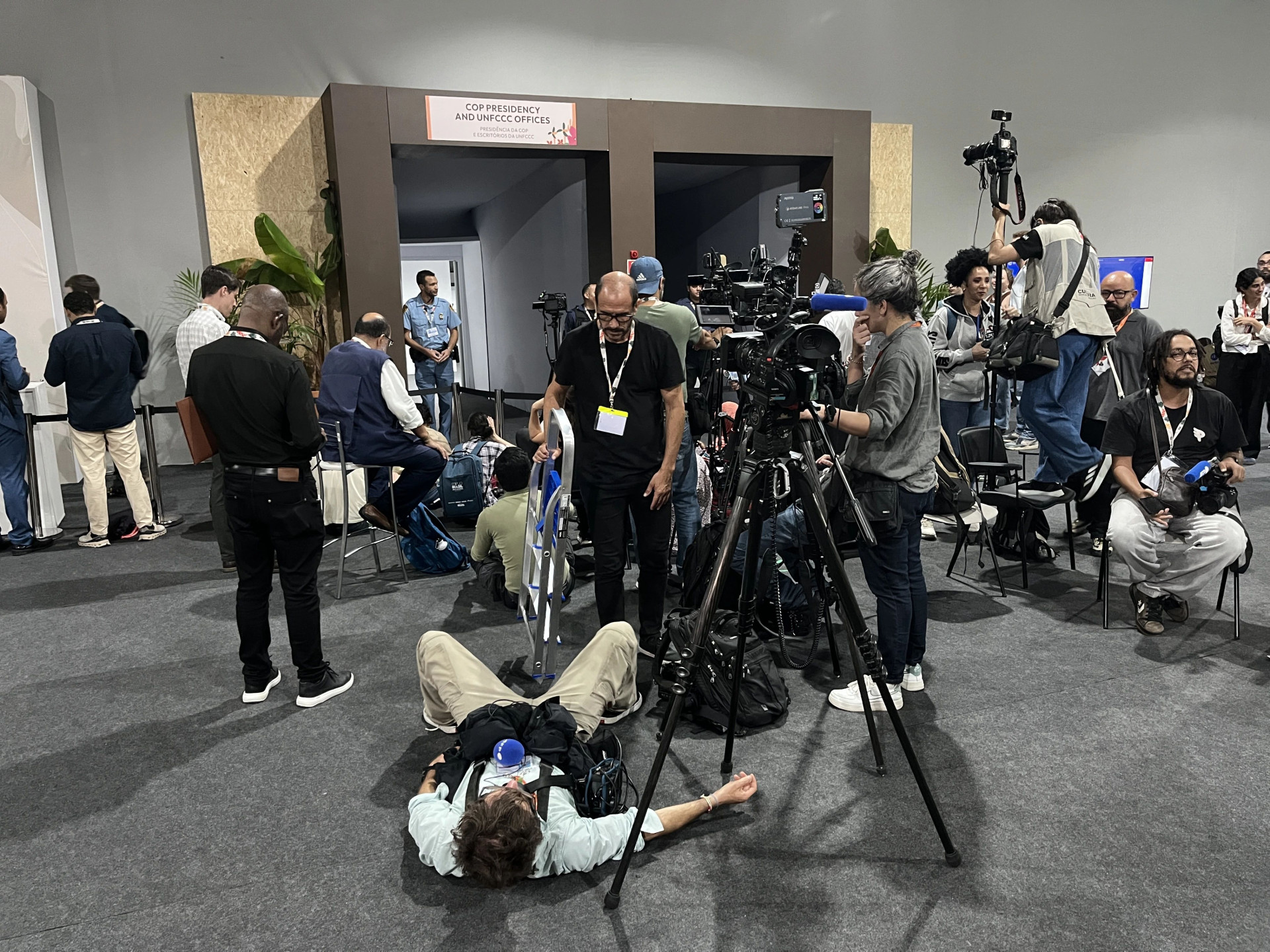 大会闭幕前一天,各国代表团磋商至深夜,会议室门外的记者在持续等待