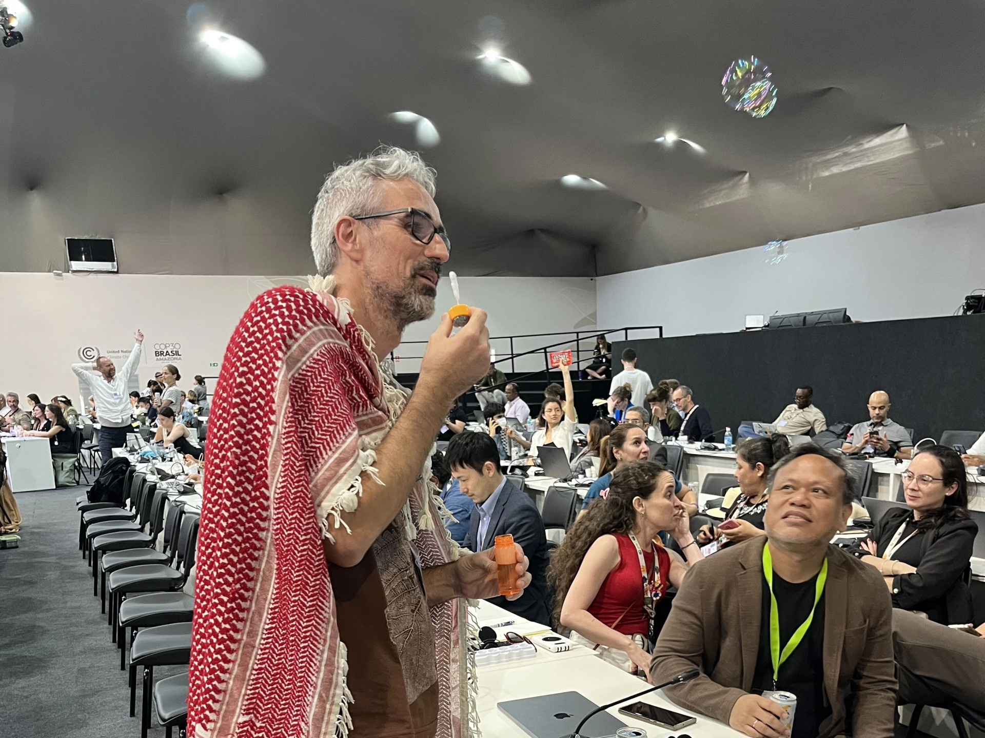 由于闭幕反复延期,参会者吹泡泡打发时间