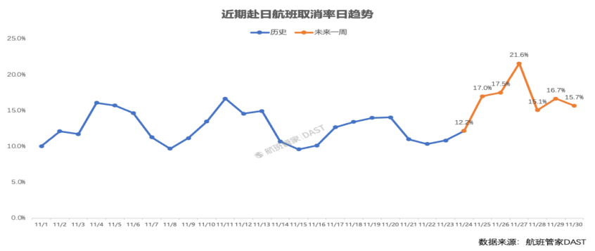 短期中国赴日人数骤降。本周(11月24日至30日)航班数据显示,从中国到日本的航班取消率持续走高,将在11月27日达到峰值的21.6%,超过两成航班被取消,为近一个月以来最高值。