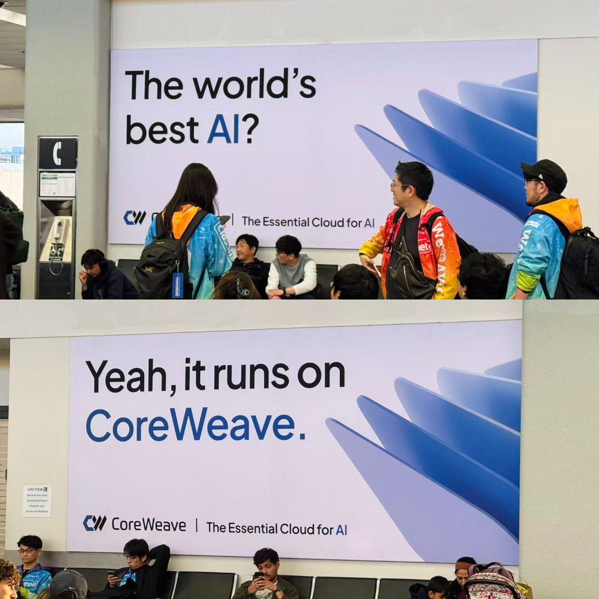 CoreWeave的广告内容是,“The world's best AI?”(世界上最好的AI是谁?);“Yeah, it runs on CoreWeave”(没错,它现在跑在 CoreWeave上)。这个广告很容易让人联想起火山引擎在国内机场的广告,“你的下一朵云”。