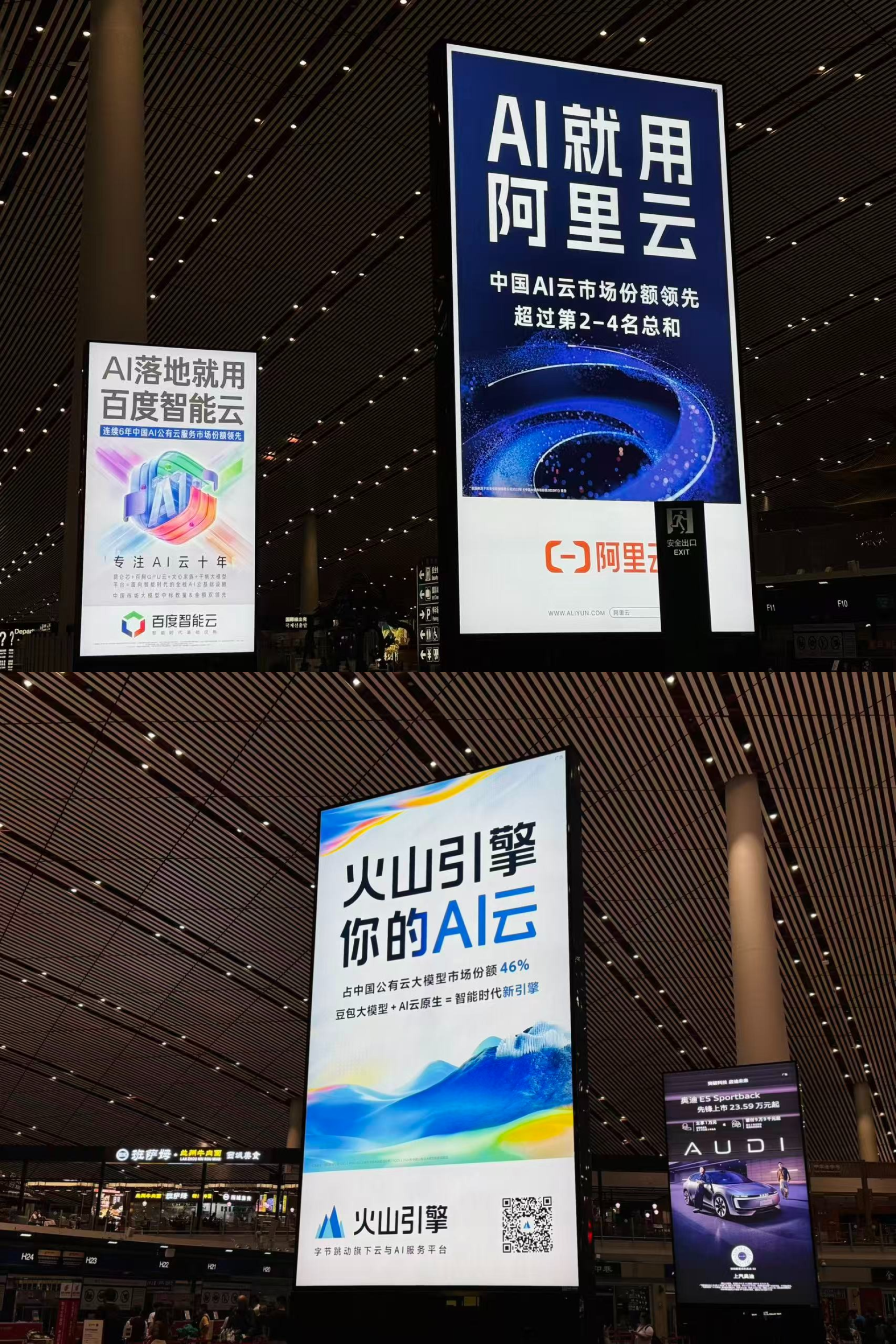 2025年,中国机场的广告是云和智能汽车的战场。阿里云、字节跳动旗下云服务火山引擎、百度智能云的广告2025年针锋相对,“AI云市场第一”广告在机场随处可见(详见《中国云市场,究竟谁是第一》)。