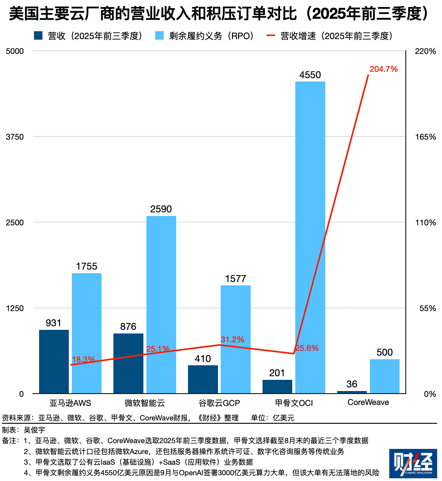 比如,大模型创业公司OpenAI与四家云厂商签署了超过6000亿美元云大单。其中,甲骨文OCI 五年3000亿美元,微软Azure数年2500亿美元,亚马逊AWS 七年380亿美元,CoreWeave 五年225亿美元。