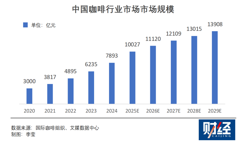据艾媒咨询数据,2024年中国咖啡行业市场规模为7893亿元,2025年将突破万亿元,增速超过27%。与此同时,人均咖啡消费量从2018年的6杯攀升至2024年的22.2杯。