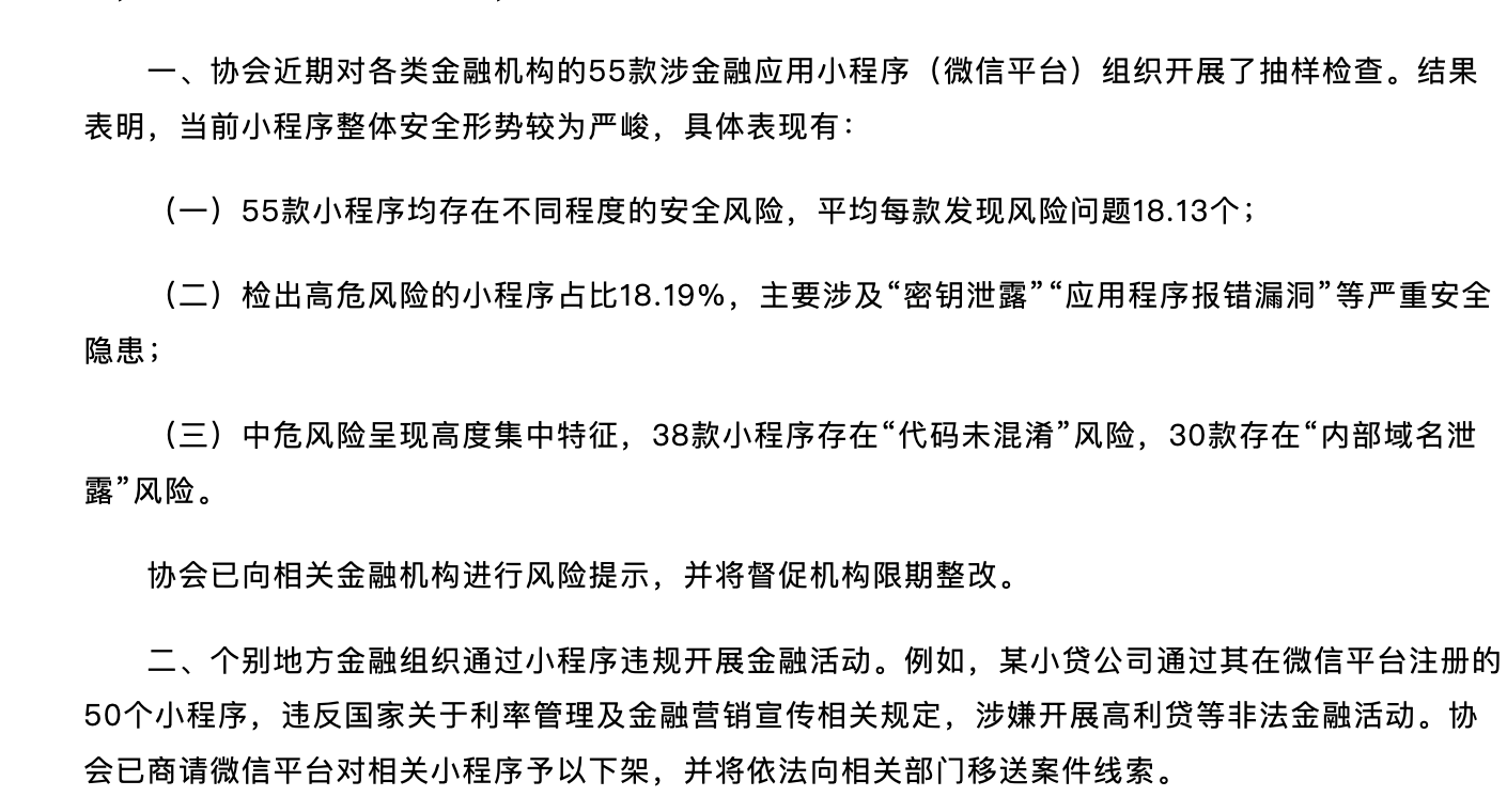 中国互联网金融协会近期对各类金融机构的55款涉金融应用小程序(微信平台)组织开展了抽样检查。结果表明,当前小程序整体安全形势较为严峻,具体表现有:(一)55款小程序均存在不同程度的安全风险,平均每款发现风险问题18.13个;(二)检出高危风险的小程序占比18.19%,主要涉及“密钥泄露”“应用程序报错漏洞”等严重安全隐患;(三)中危风险呈现高度集中特征,38款小程序存在“代码未混淆”风险,30款存在“内部域名泄露”风险。