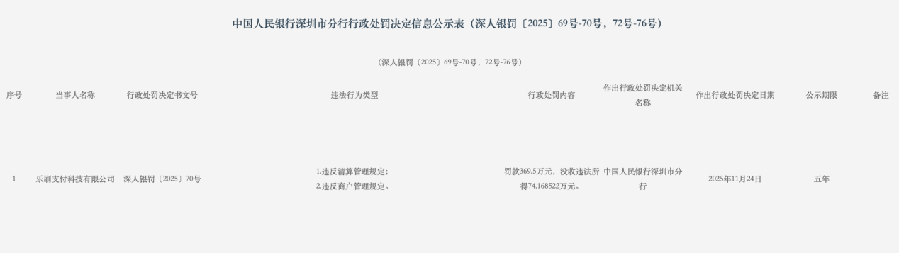 11月28日,中国人民银行深圳市分行行政处罚决定信息显示,乐刷支付科技有限公司因“1.违反清算管理规定;2.违反商户管理规定”,被罚款369.5万元,没收违法所得74.168522万元。