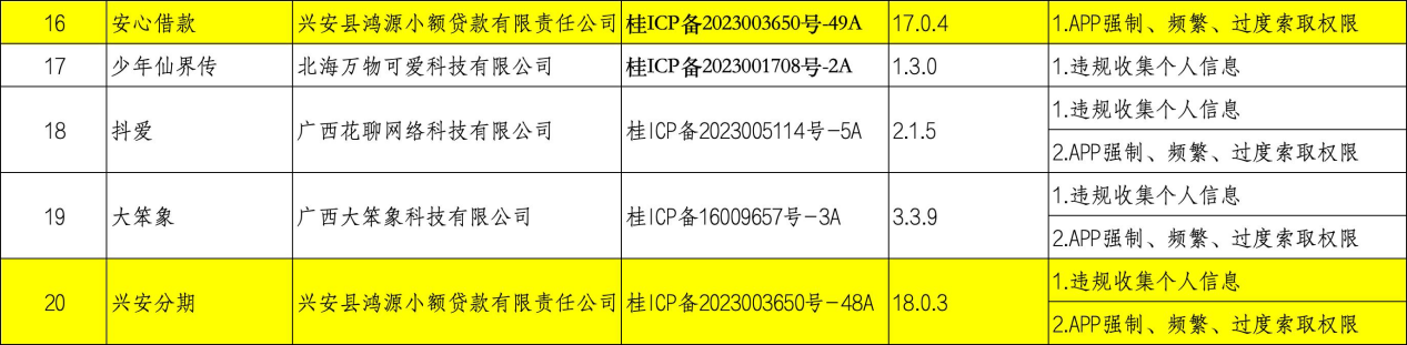 12月1日,广西壮族自治区通信管理局发布《关于34款侵害用户权益行为的APP通报》,其中“安心借款”和“兴安分期”两款借贷应用被通报,其主体公司均为兴安县鸿源小额贷款有限责任公司。其中,“安心借款”所涉问题为“APP强制、频繁、过度索取权限”;“兴安分期”所涉问题为“违规收集个人信息;APP强制、频繁、过度索取权限”。
