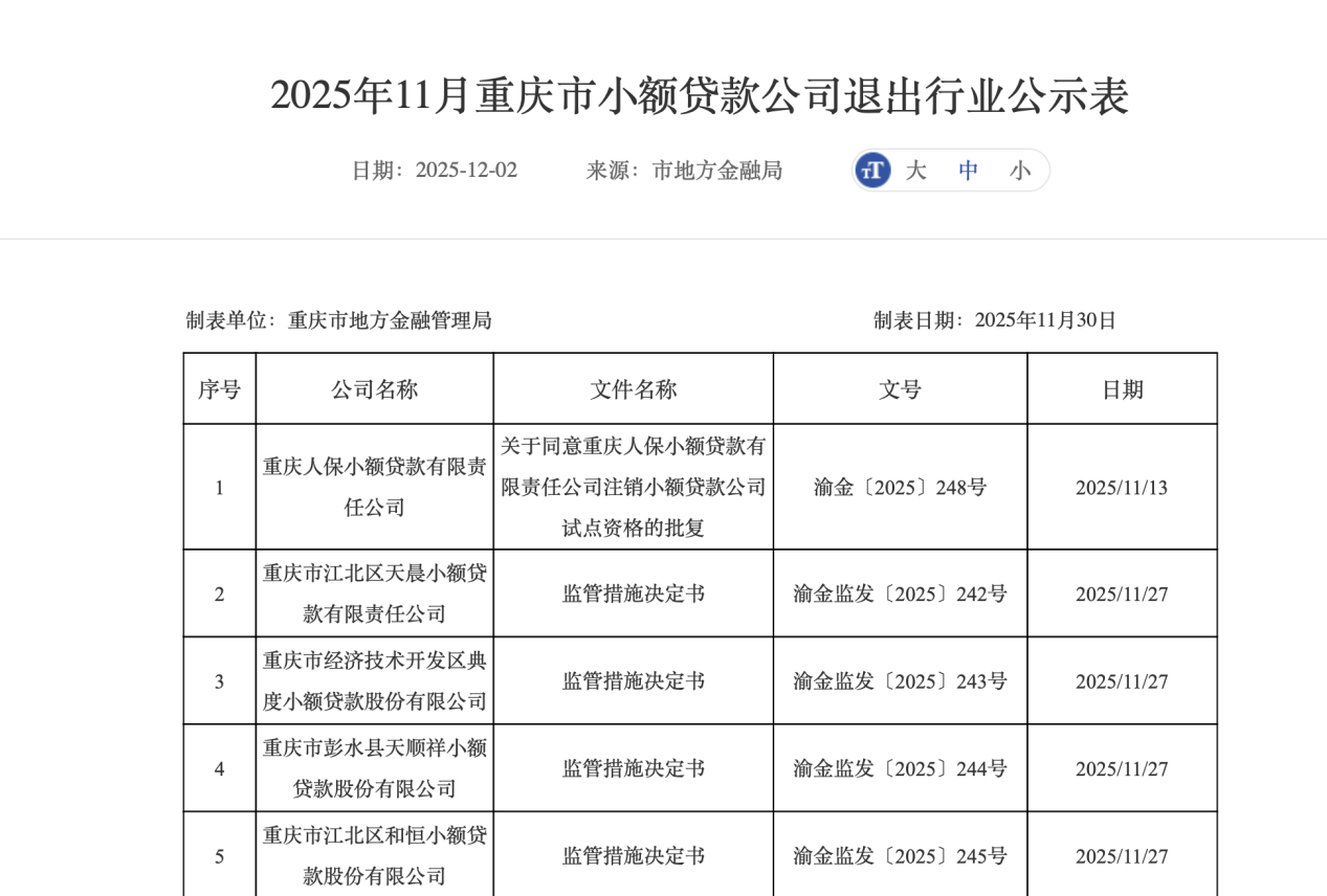 12月2日,重庆市地方金融管理局发布《2025年11月重庆市小额贷款公司退出行业公示》显示,共有21家小额贷款公司退出行业,其中包括重庆人保小额贷款有限责任公司和重庆乐视小额贷款有限公司。