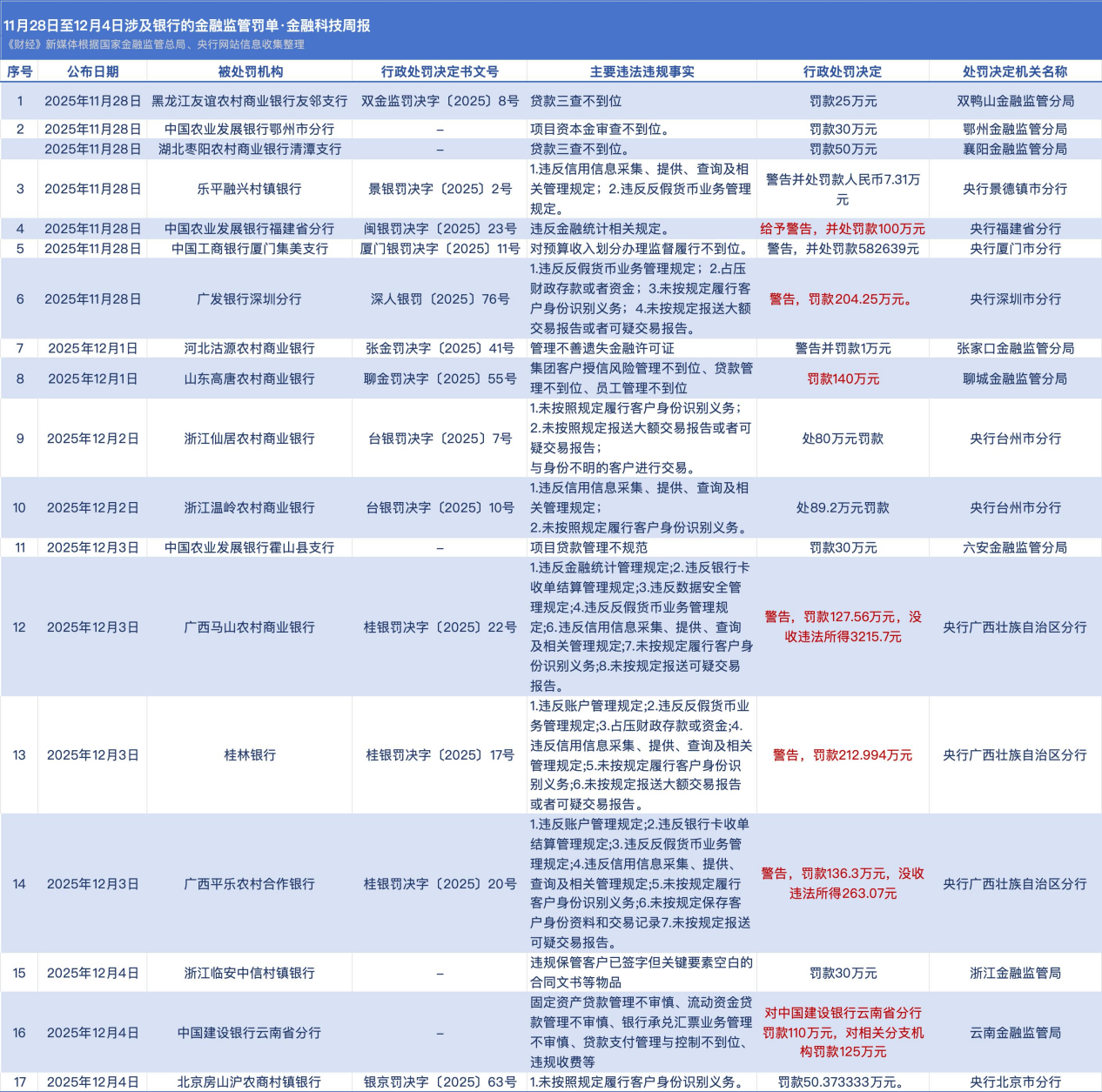 11月28日至12月4日,央行、国家金融监督管理总局官网披露17张涉及银行的罚单。