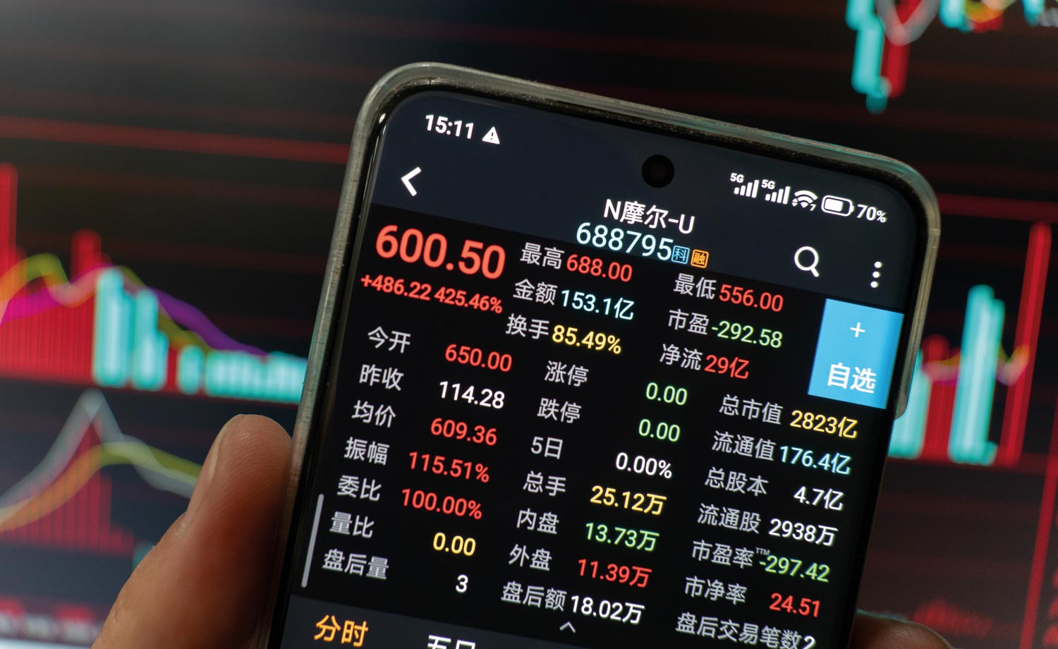 12月5日,摩尔线程正式登陆科创板,首日大幅高开468.78%至650元/股,随后股价高开高走,最高涨至688元/股,最高涨幅为502%。截至当日收盘,摩尔线程股价上涨425.46%%至600.5元/股,总市值为2822.5亿元,在科创板中排名第五位,高于晶圆代工龙头企业华虹公司(688347.SH),低于创新药龙头企业百济神州(688235.SH)。中一签摩尔线程新股,如按最高价688元/股计算,最高将赚约28.7万元。