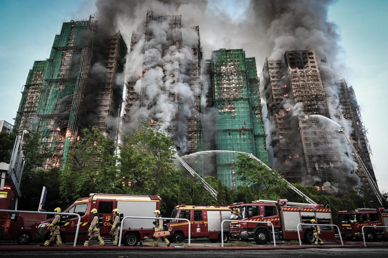 没有人想到这座楼龄42年的屋苑会成为历史焦点。从14点51分棚架冒起明火,到15点02分火势在爆炸声中冲破高层,再到18点22分大火接连吞噬7栋大厦,仅四个小时,烟雾将7栋31层高楼笼罩成一片,高温致使大量脚手架坍塌,地面救援通道遭到阻断。