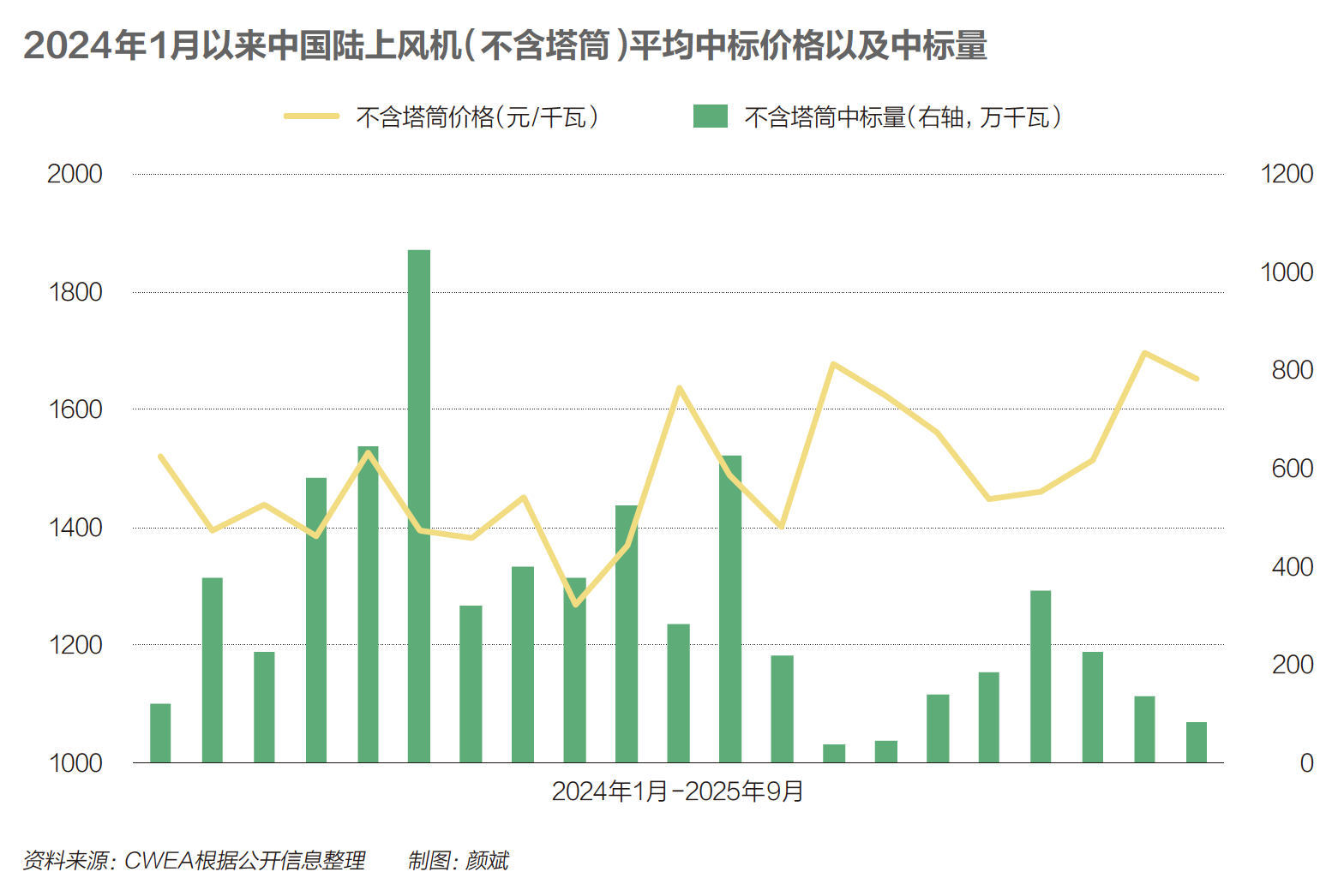 从2024年11月至今,中国风机中标价格(不含塔筒)再也没有低于1400元/千瓦——这是大部分风机的成本线。