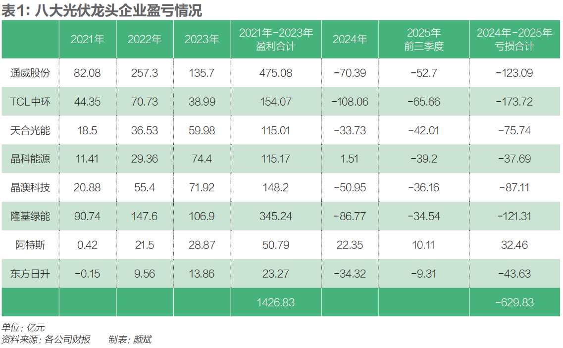 据《财经》统计,光伏八大龙头企业在2024年和2025年前三季度共亏损629.83亿元。此前三年(2021年-2023年)里,这八家企业共盈利1426.83亿元。业内认为,大部分企业积攒的利润仍可以承受当前的亏损。若让市场之手自行调节,光伏产业大规模去产能的时机尚未到来。