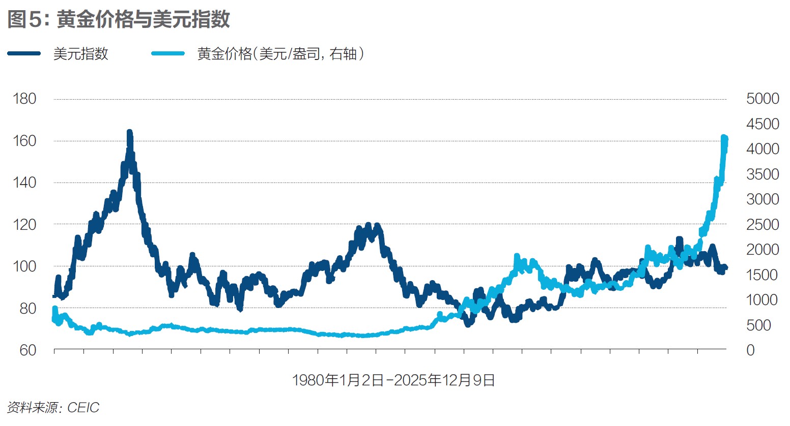 全球黄金价格交易主要以美元计价,因此美元自身价格变动也会影响黄金的美元价格。换言之,黄金价格与美元指数的走势之间应该存在负相关。如图5所示,从历史数据来看,两者之间的确存在一定的负相关,但相关性随着历史推移不断变化。例如,2025年美元指数总体上贬值了10%,但黄金价格上涨了60%。换言之,美元汇率变动的确可能影响黄金价格,但也并非黄金价格变动的主要因素。