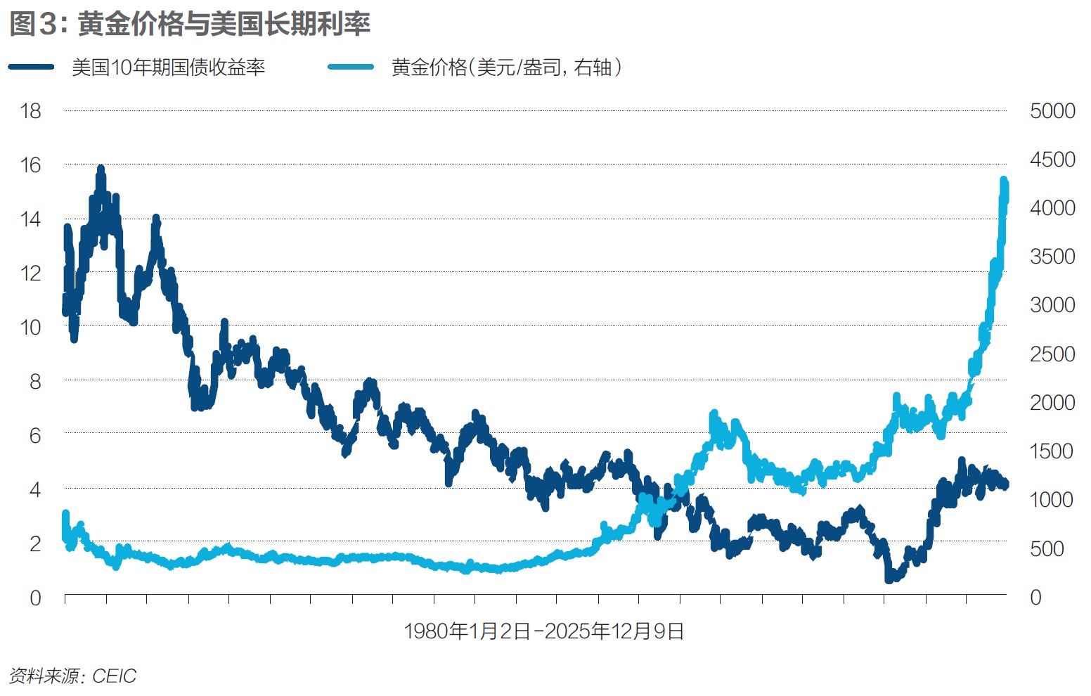 作为一种避险资产,黄金价格走势应该与刻画全球经济风险、全球地缘政治风险的指数走势之间呈现明显的正相关。如图4所示,不难看出,黄金价格走势与全球经济政策不确定性指数走势之间的正相关,要明显强于黄金价格走势与全球地缘政治风险指数走势之间的正相关。在2025年4月特朗普政府推出“对等关税”之后,全球经济政策不确定性指数上升至628的历史性峰值,可以显著拟合黄金价格的上涨。然而,随着特朗普政府显著调整其关税政策,全球经济政策不确定性指数已经下降至2025年10月的389。此外,在今年4月至今,全球地缘政治风险指数总体上也在下降。但迄今为止,黄金价格依然保持在每盎司4200美元左右的高位。至少从图4中反映的关系来看,如果2026年上半年国际经贸冲突没有明显恶化,那么黄金价格存在显著回调的可能性。