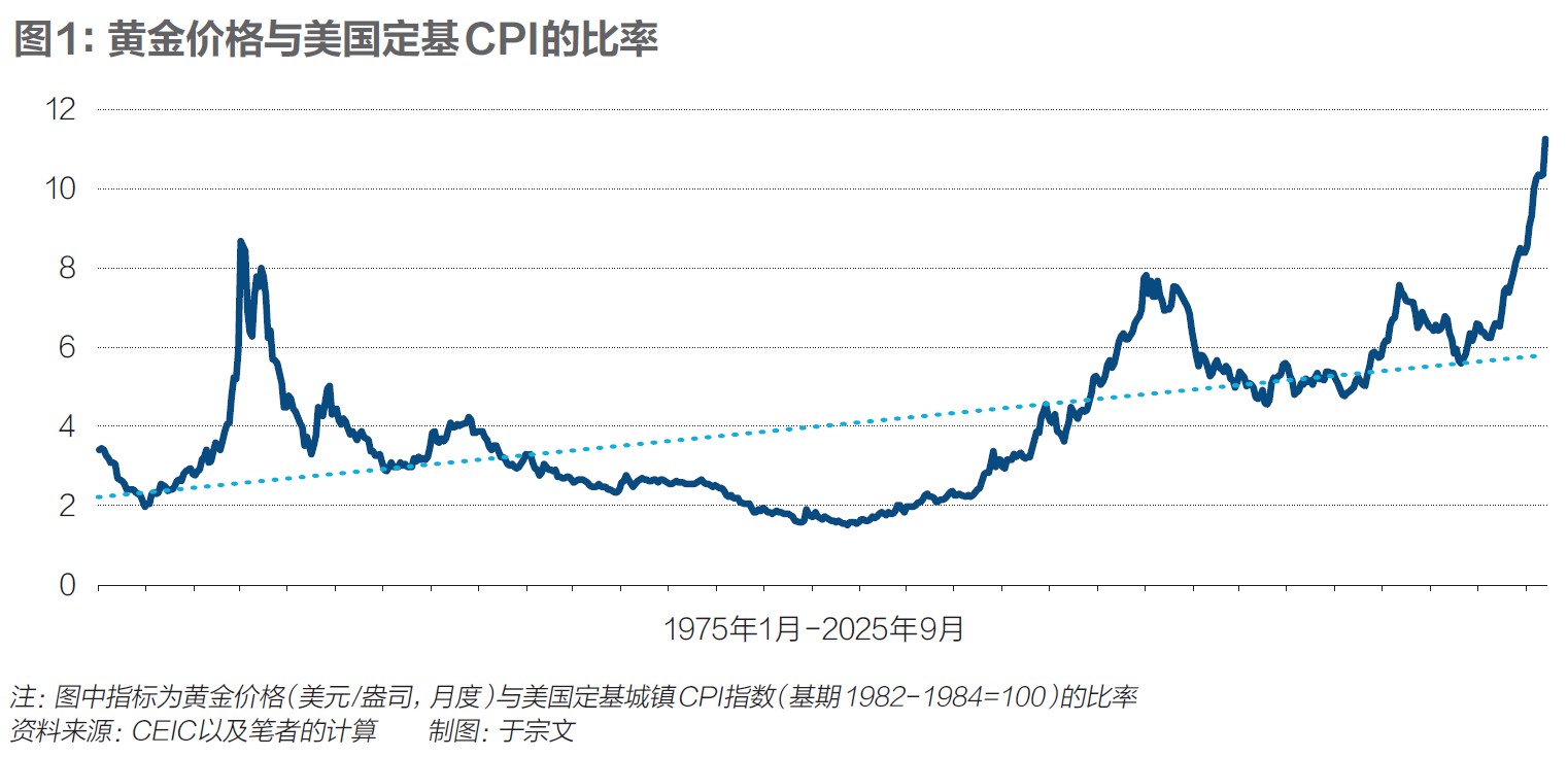 长期以来,黄金价格被认为能够对抗通货膨胀。Erb与Havey(2013)的研究发现,历史上黄金价格与美国定基CPI(消费者物价指数)指数的比率平均为3.2倍,这个比值可以视为反映黄金购买力波动均值的黄金常数,且黄金价格大约在十年的时间维度内呈现均值回归的趋势。不过如图1所示,随着2022年之后黄金价格不断创出历史新高,黄金价格与美国定基CPI指数比率的均值不断抬升,目前已经接近6倍左右。值得注意的是,自2010年以来至今,黄金价格与美国定基CPI指数的比率大致已经连续15年高于历史均值,且当前黄金价格与美国定基CPI指数与均值的偏离程度,已经与1980年初的上一次历史高位相仿。换言之,从黄金价格对抗通货膨胀的视角以及均值回归的视角来看,黄金价格回落调整的概率随着时间的推移将会不断上升。