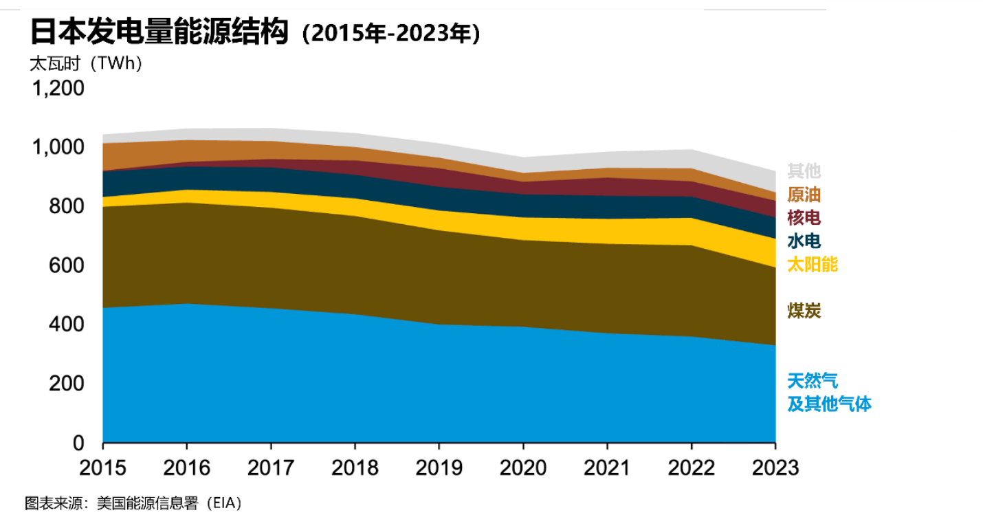 随着核反应堆陆续重启,核电占比回升,但当前化石燃料仍是大头。2024年,日本电力结构中化石燃料发电量约占六成,其中LNG发电约31%、燃煤发电约28%。低碳能源合计约占三分之一,其中可再生能源约占25%,核能发电约占9%。