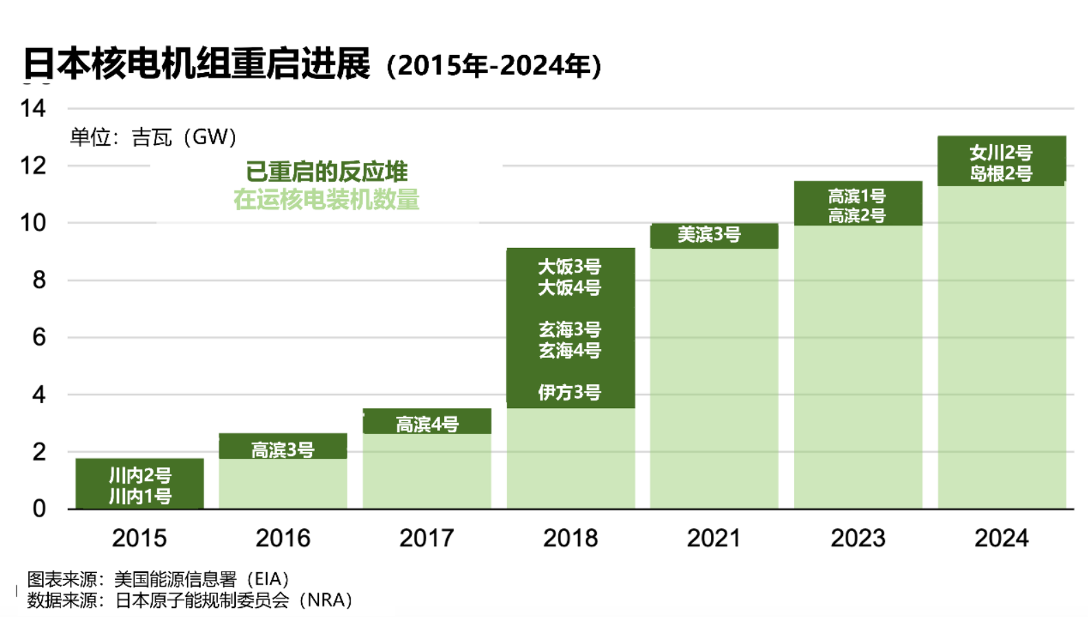 为降低能源成本和碳排放,日本自2015年起在严格的新安全标准下陆续重启核电机组。截至目前,日本全国33座可运转核反应堆中已有14座通过审查并重启发电,另有约11座正在申请或筹备重启的过程中。