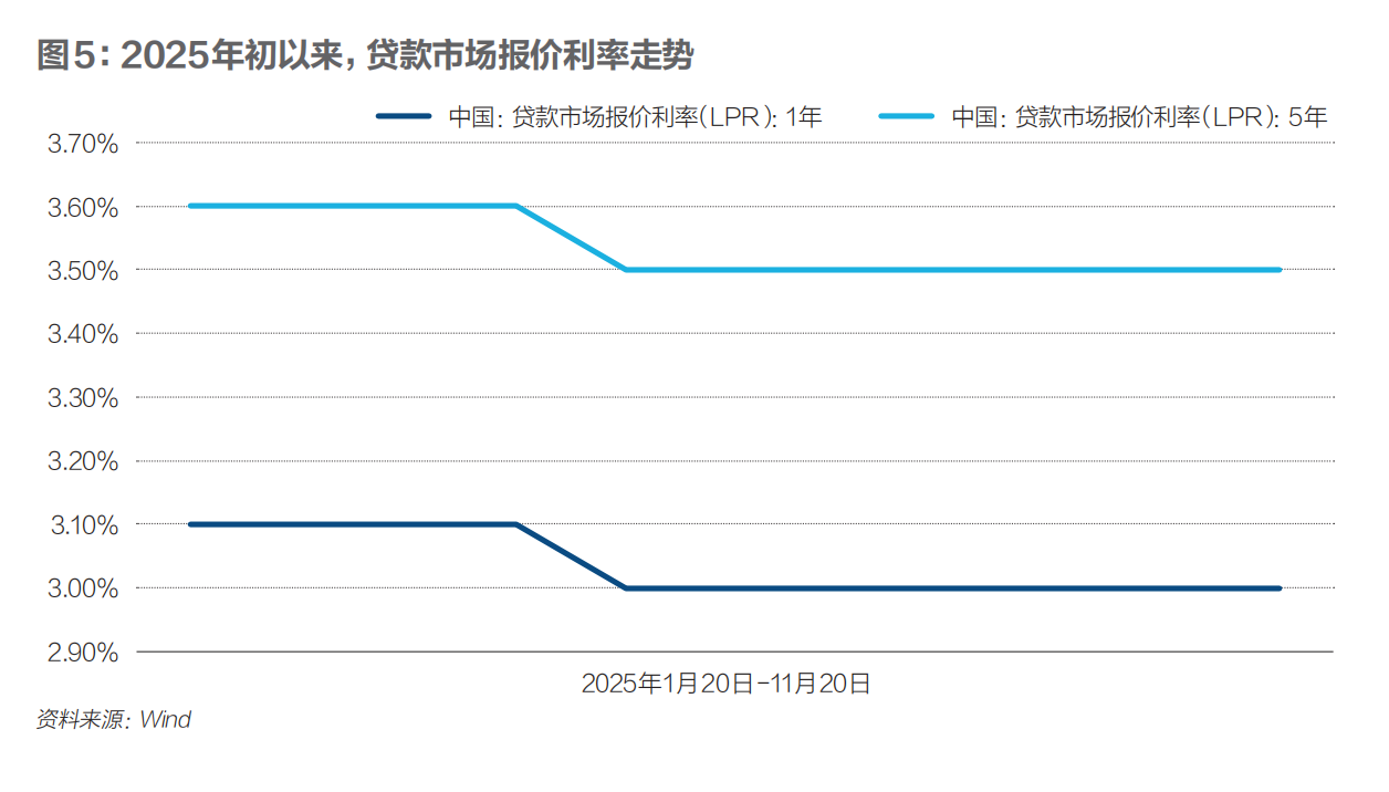 截至2025年12月19日,央行政策利率(7天期逆回购操作利率)为1.4%,1年期和5年期LPR分别为3%和3.5%,均处于历史低位。2025年11月,企业新发放贷款(本外币)和个人住房新发放贷款(本外币)的加权平均利率均在3.1%附近,亦处于历史相对低位。