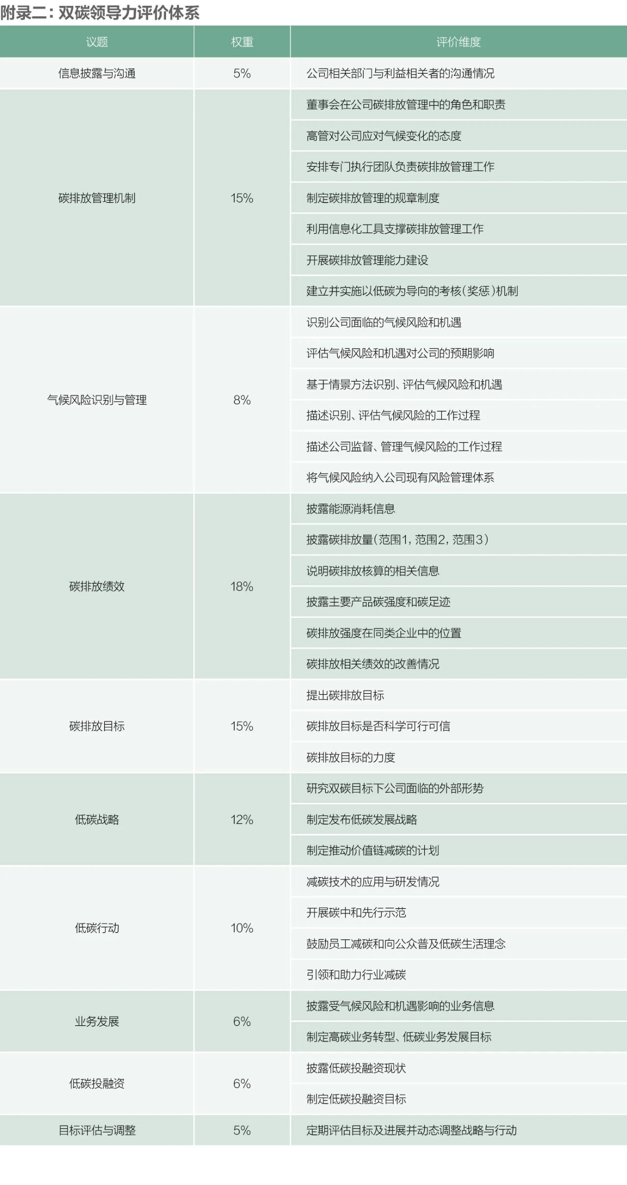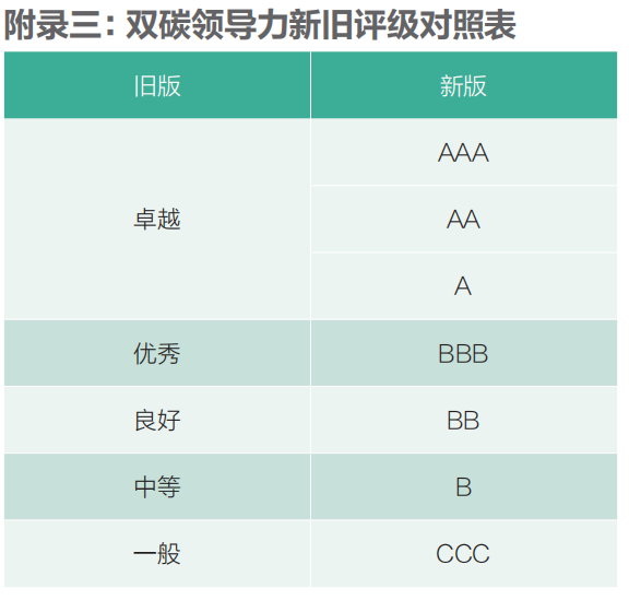 为精准衡量这些头部企业在响应国家气候承诺过程中所展现的前瞻性战略规划、组织执行能力和实际减排成果,我们结合双碳目标设计了双碳领导力榜单。该体系通过涵盖十大核心议题和数十项细化指标的全面评分,将企业的领导力水平划分为:AAA、AA、A、BBB、BB、B和CCC七个等级。评价议题涵盖碳排放管理机制的建立与全面覆盖、气候风险识别与管理能力的系统性构建、碳排放绩效的量化展示与持续改善、科学可信的碳排放目标设定、低碳战略的制定与价值链协同、低碳行动的深度与创新性、业务发展的绿色转型路径、低碳投融资的规模与效果,以及目标评估调整的动态机制。