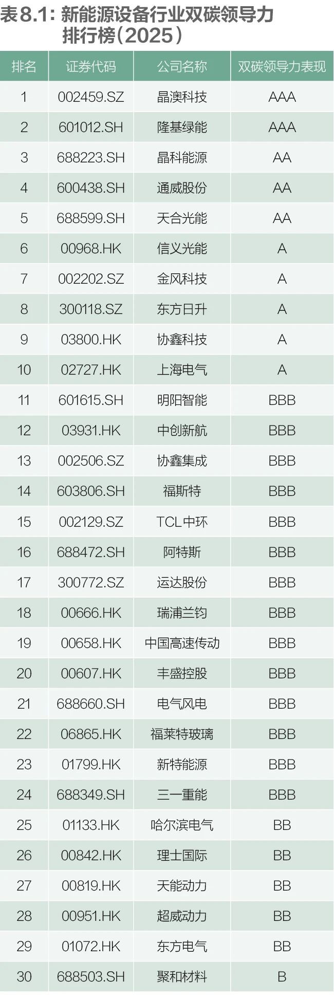 2025年榜单显示,新能源设备行业的企业对于双碳管理工作的改进卓有成效,双碳领导力评级为“A”及以上的企业数量相较2024年榜单增加明显,多达10家,“BBB”等级企业共14家,“BB”等级企业5家,“B”等级仅有1家。