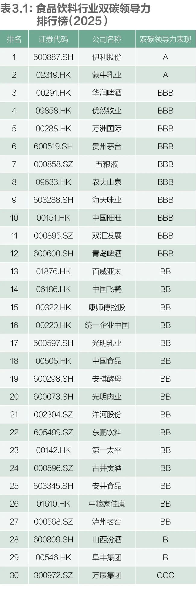 今年榜单中,伊利股份、蒙牛乳业评级为“A”,连续两年保持行业领先;华润啤酒、优然牧业等10家上市公司获“BBB”评级。评级为“BB”“B”和“CCC”的上市公司分别有15家、2家、1家。获得BB级别及以上的企业较去年增加3家。食品饮料企业双碳能力建设呈现稳中向好的局面,但整体仍有较大提升空间。