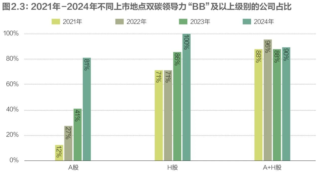 上榜的100家公司分别在A股、H股和A+H股三个市场上市。前三年均呈现出“A+H股高等级比例最高,H股次之,A股最低”的特征,这可能与港交所对上市公司ESG治理层面的严格要求有关。2024年,A+H股和H股上市的公司在“双碳”目标方面依然表现出色,H股上市公司“BB”及以上等级比例甚至反超A+H股,而A股市场在往年市场表现与另外两个市场有相当距离,前三年占比均不足50%。为了解决这一问题,A股交易所逐渐推进ESG信息披露迈向标准化,沪深北交易所自2024年5月1日起实施《上市公司可持续发展报告指引》,对ESG信息披露方面作出明确规范,这促使A股的上市公司越发重视低碳工作。A股市场维持着占比逐年上升的趋势,从12%提升至81%,在2024年迎头赶上另外两个上市地的公司水平。