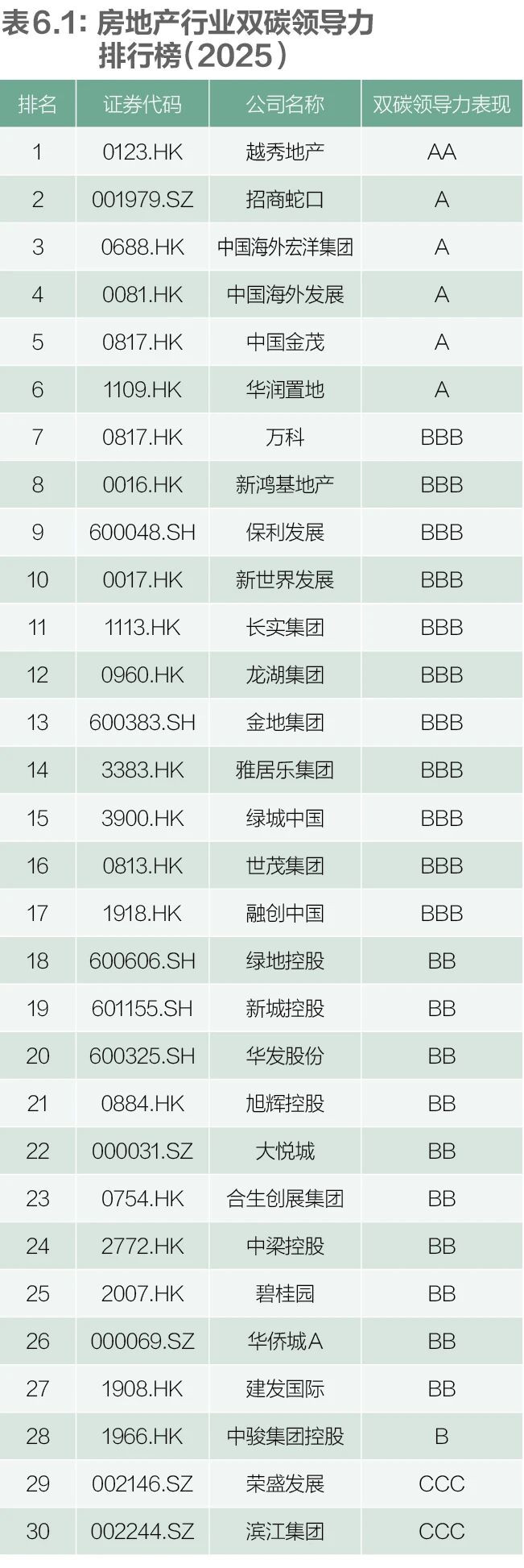 2025年榜单中,房企双碳领导力整体呈现“头部趋优、中段胶着、尾部掉队”的分化格局。相较于2023年“两极分化、部分房企缺乏改善”的态势,头部企业在双碳议题上的投入与披露显著增强,营收前30强房企中,获评“A”和“AA”等级的企业增至6家,占比达20%,较上年度增加4家;另有11家企业获评“BBB”等级。