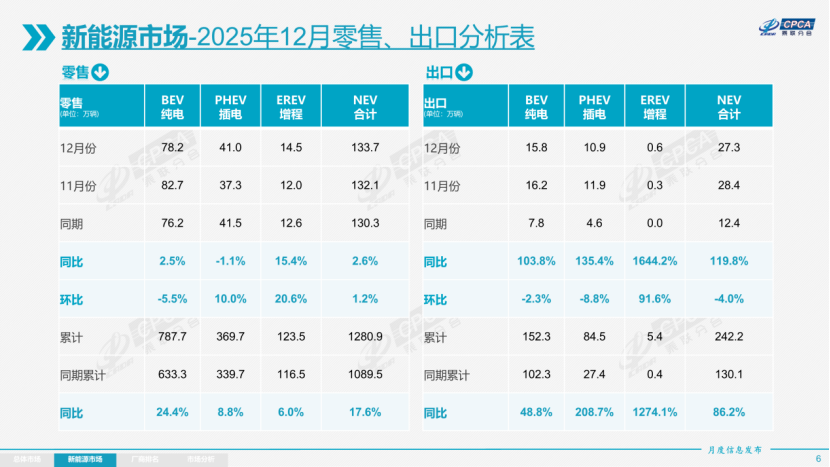 从全年维度看,新能源仍是乘用车市场中最具确定性的增量来源。统计显示,2025年新能源车累计零售1280.9万辆,同比增长17.6%,零售渗透率达54%。