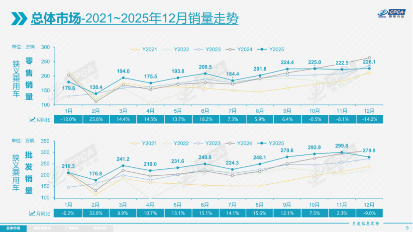 尽管2025年12月全国乘用车零售同比下降14%,从全年数据看,中国车市仍实现3.8%的同比增长。2026年1月9日,中国汽车流通协会乘用车市场信息联席分会(下称“乘联会”)发布最新统计数据显示,2025年12月中国乘用车零售226.1万辆,环比微增1.6%;2025年累计零售2374.4万辆。