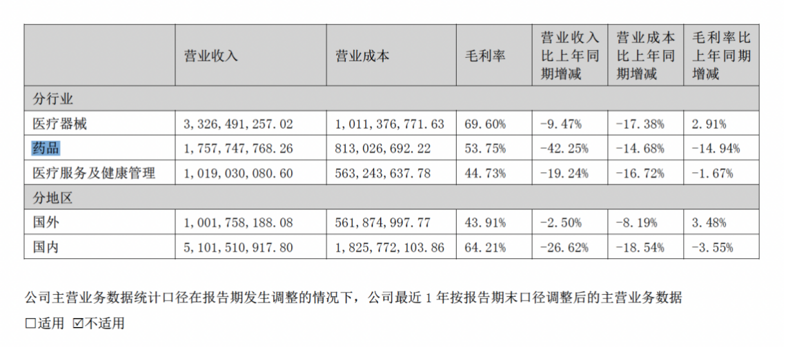 乐普医疗的主营业务有三大板块,以仿制药为主的药品收入在下降,在总收入的占比从2021年的42.44%,下滑到2024年的28.8%。