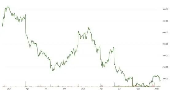 lululemon从2024年巅峰期至今的股价变化。截图自NASDAQ