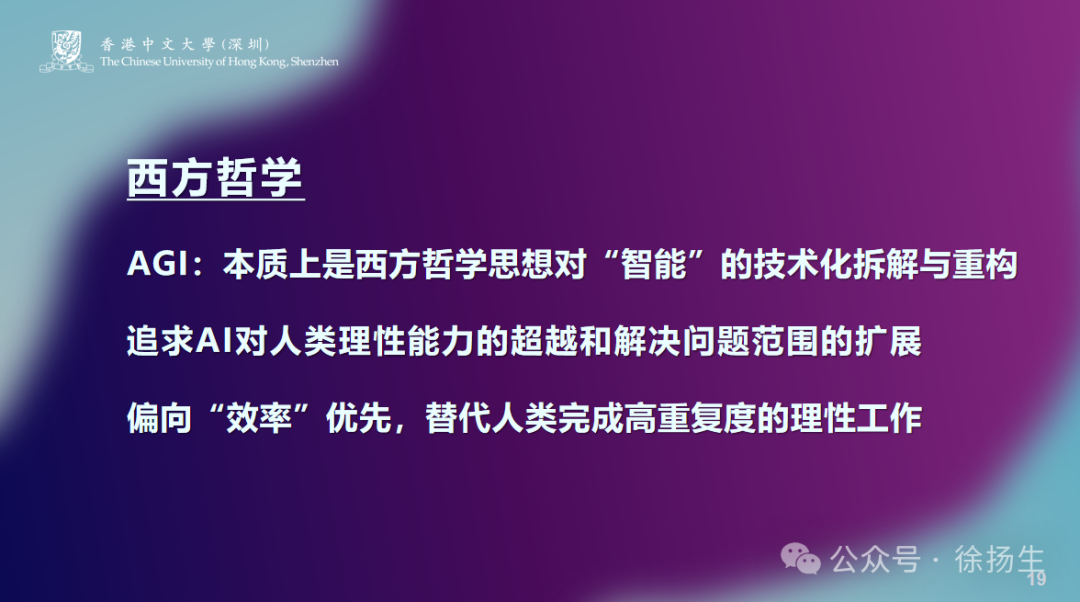 从西方哲学的角度来说,“智能”本质上是技术的拆解与重构,现在的AGI,追求的是对人类理性能力的超越和解决问题范围的扩展,我的理解,其实就是让大家效率变高了。拿下围棋为例,如果能把对方的所有技术和招数进行拆解,打败对方就很容易了,以前可能需要成千上百个小时,但现在在AI的帮助下,不需要这么久了。所以,西方哲学是在做拆解,强调效率,基础是“理性”。