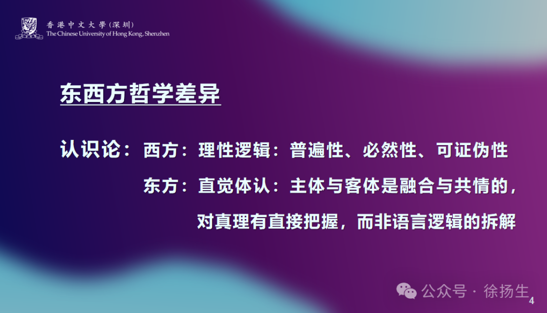 再说认识论,西方认识论的核心是理性逻辑:一件事一定会讲“为什么”,是讲道理的。东方认识论坦率讲确实不那么严格,一个事情并不会讨论“为什么”。东方哲学家当中,唯一一个例外是庄子,他还会说明一下“我为什么这么说”。东方哲学更强调的是直觉体认,体认很重要:主体跟客体是融合与共情的,所有的感情都与“心”有关。东方的哲学对真理有直接把握,真理不是理性分析出来的,不是由数据整理出来的,也不是由语言逻辑拆解出来的,而是体验出来的。比如我是一个女生,看到一个男生,我爱上了这个男生——这是由直觉出发的,没有逻辑,也很难说清楚“为什么爱”,这是不能用语言解释的。