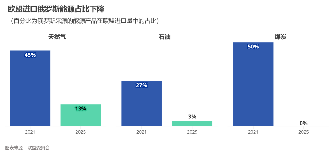 近年来,欧盟从俄罗斯进口的天然气和石油都已大幅下降。2025年,欧盟进口俄罗斯石油量已降至进口石油总量的3%以下,进口俄罗斯天然气下降至其进口总量的13%,价值超过150亿欧元。2021年时俄罗斯在欧盟管道天然气进口量中的占比超过40%。