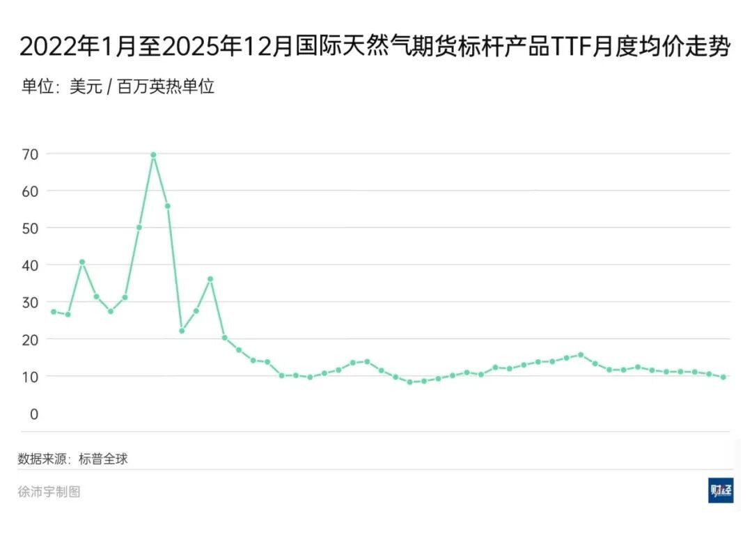 业内认为,在欧洲天然气供应格局深度重构、全球天然气供应基本面宽松的背景下,欧盟停止进口俄罗斯天然气不会对欧盟以及全球天然气价格造成太大影响。2025年,国际天然气价格大幅度下跌,其中荷兰TTF天然气期货价格2025年全年下跌了22.394欧元/兆瓦时,跌幅高达44.29%,远高于同期的布伦特原油期货价格18.79%的跌幅。